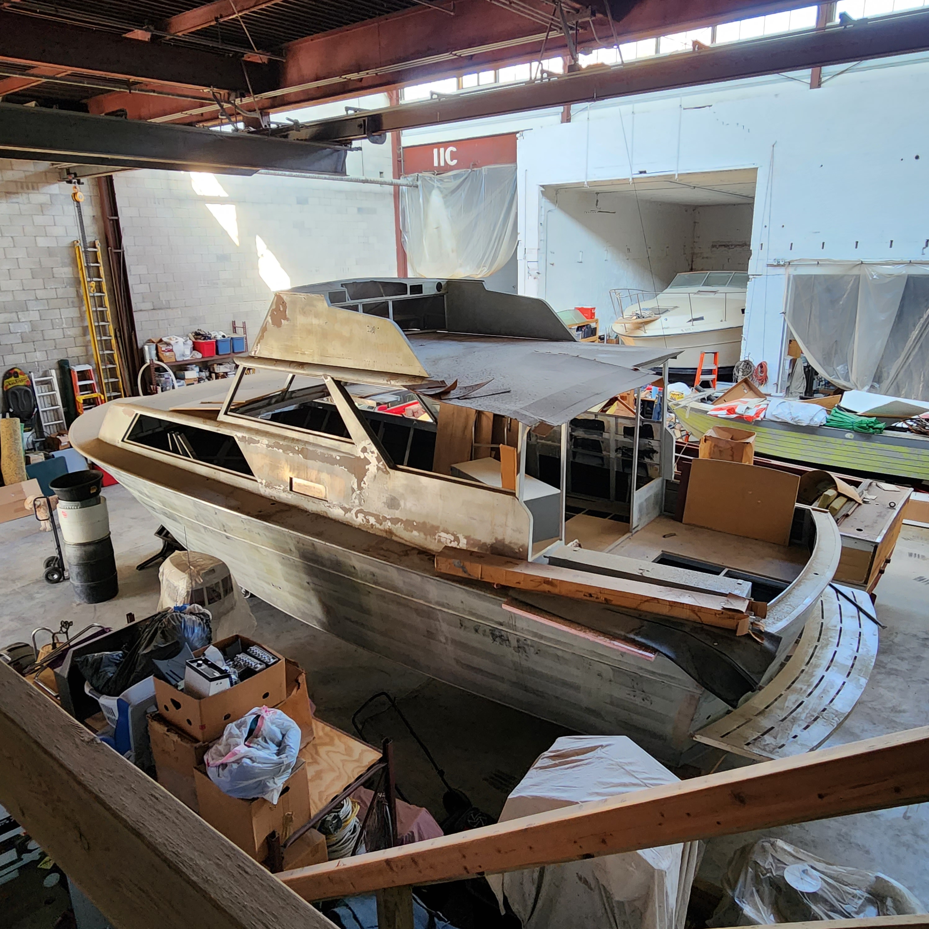 It is a Sedan and has always been kept in my heated shop. The story is owners bought her and took her out a few times....then brought her home and the 2 of them stripped the boat of everything including paint......she is sitting in bare aluminum......most everything is there but shafts and props....I dont think original fuel tanks are there he made up new ones that were twice the size because he wanted to go to the Bahamas.