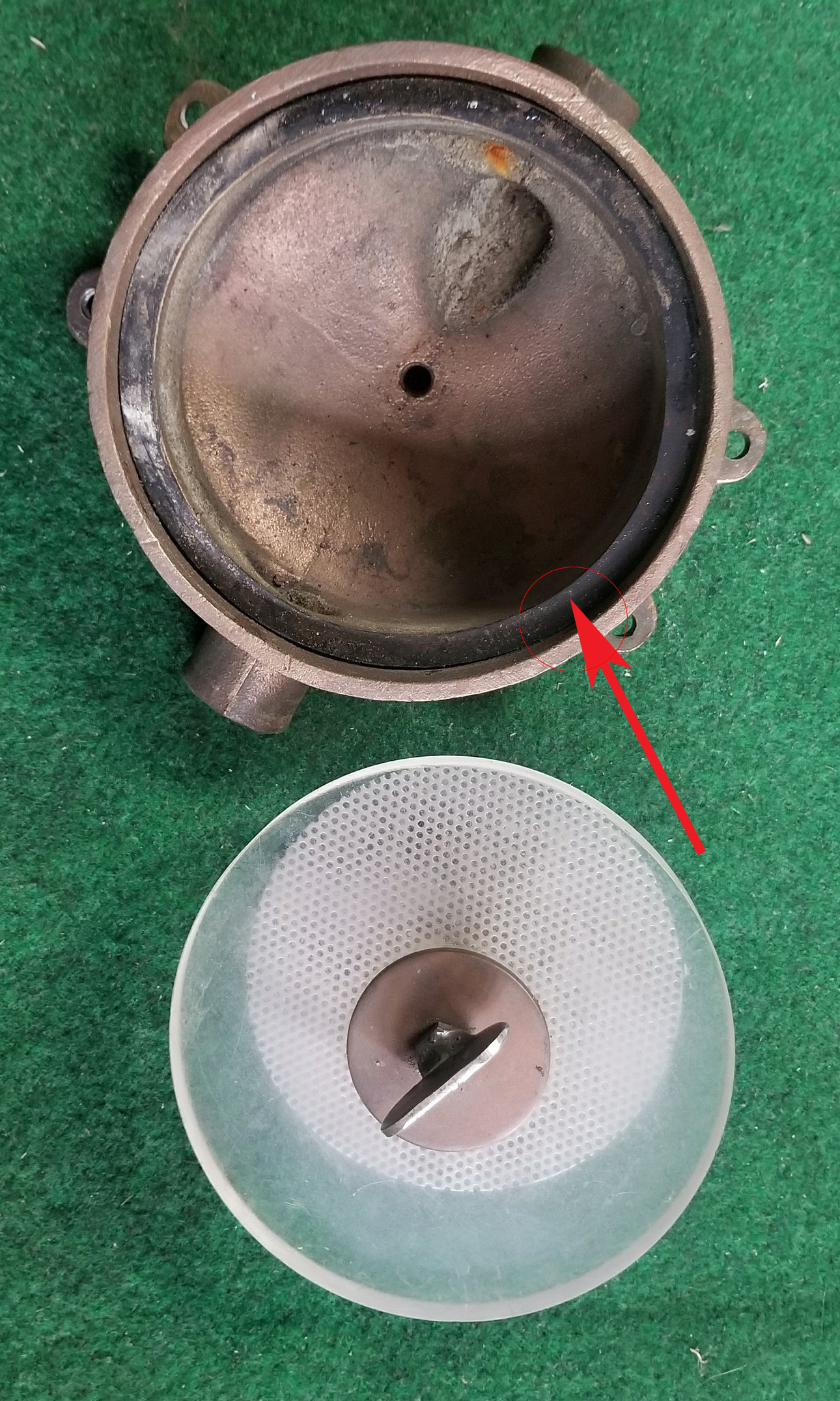 Thank you for the replies! I did buy a sheet of cork/rubber from autozone to cut the ring. I was expecting this to be a large diameter O ring sandwiched between the cap and the brass (but, I honestly don't know). Now, I don't know what/where this o-ring will be - i thought it was this big gasket indicated by the red arrow.