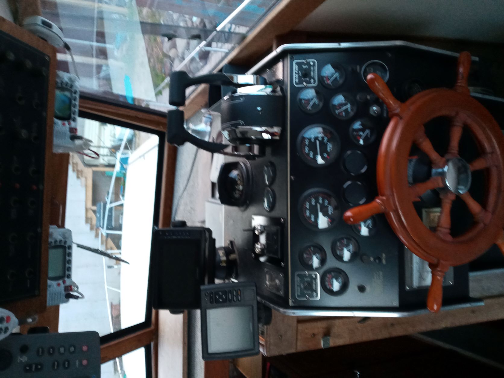 Here is the new control for the engines after some re-configuring. I had saved the old wheel off of my 28 before I sold it and installed on this boat. I like the old wood spoke wheel versus the newer destroyer style stainless wheel.
