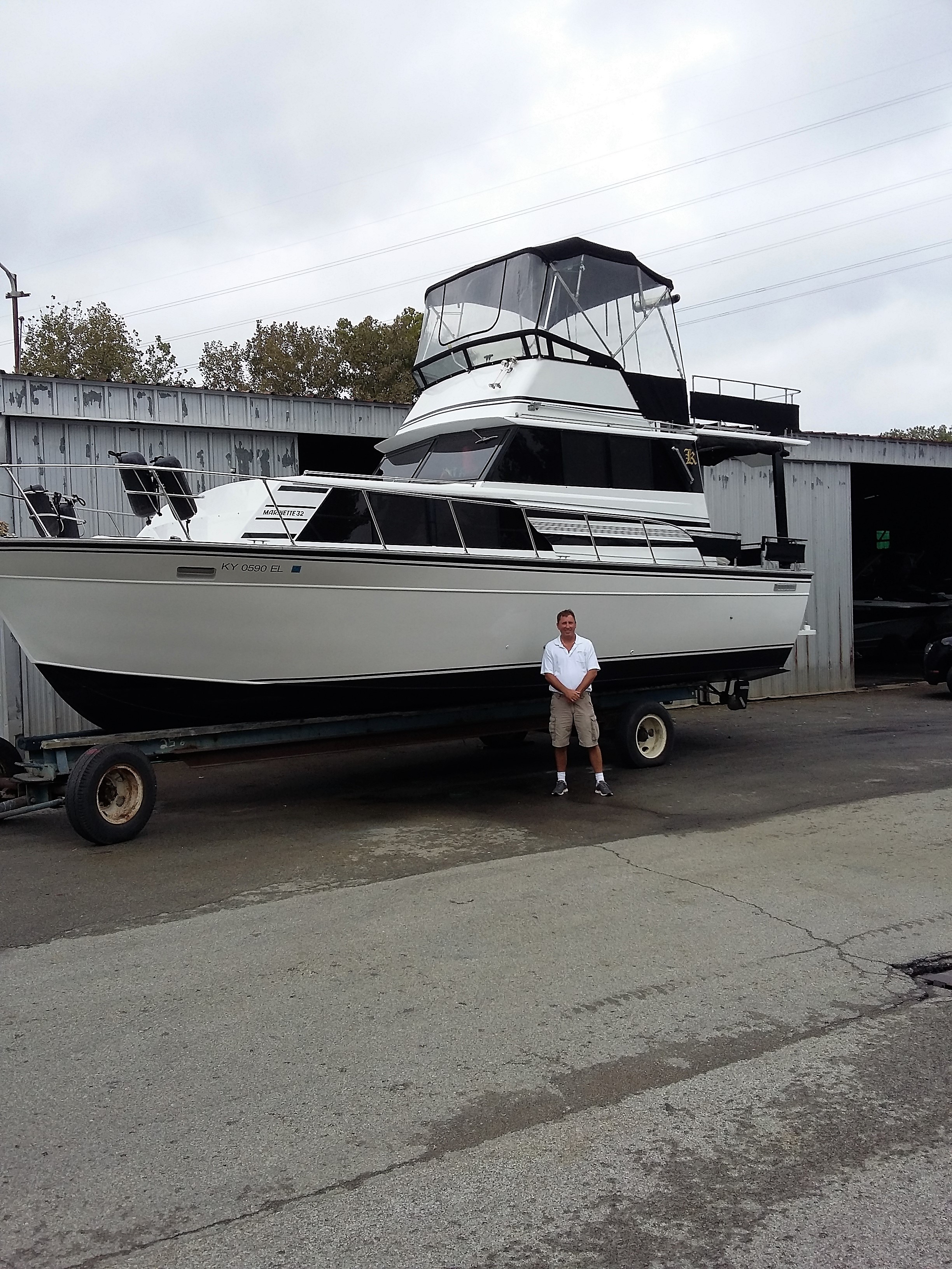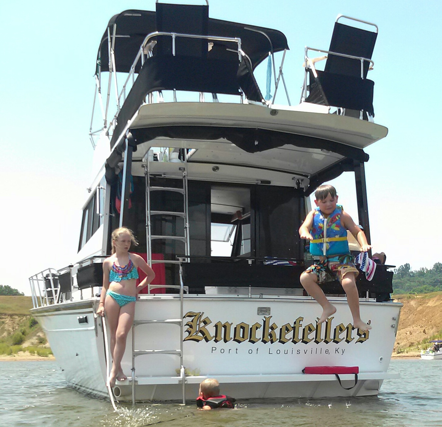 1988 sedan flybridge. Black / White. 318 240 hp Aluminum aft deck hard top. Louisville Ky . Tartans landing. " KNOCKEFELLERS"