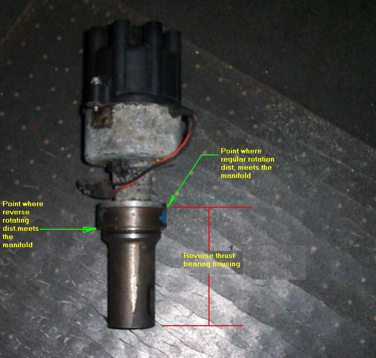What am I missing here. Distributors are the same. It's the cam that has the gear reverse ground to make the distributor turn the same direction. Since the cam is turning the opposite direction, the collar is used to keep the distributor from riding up.