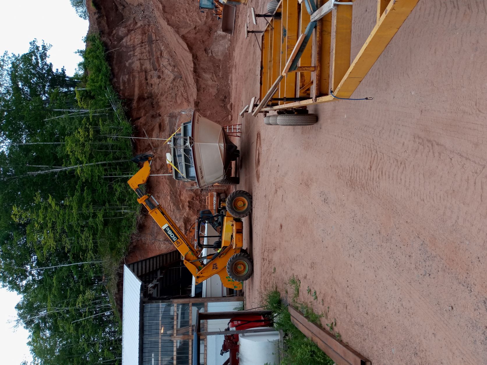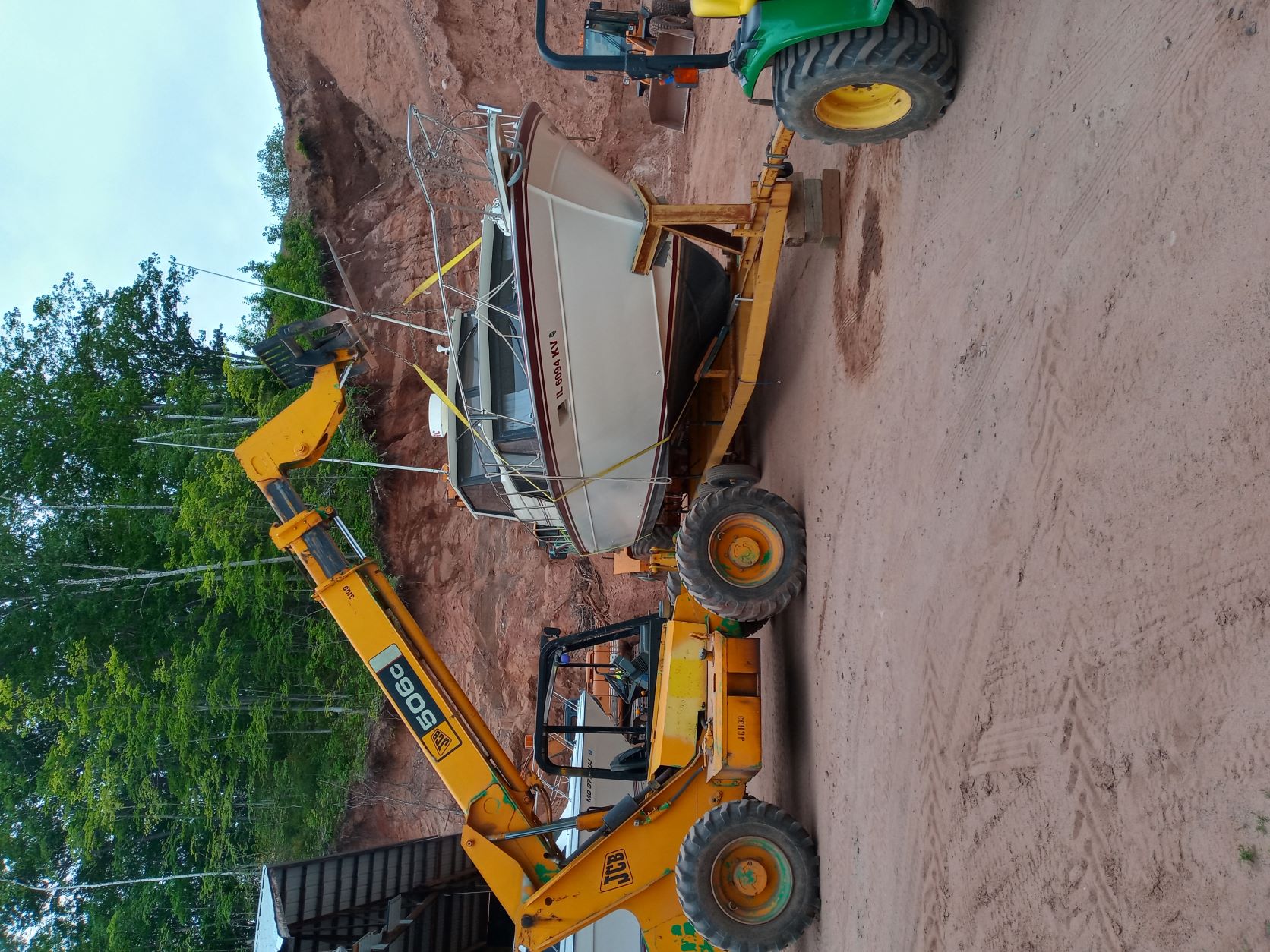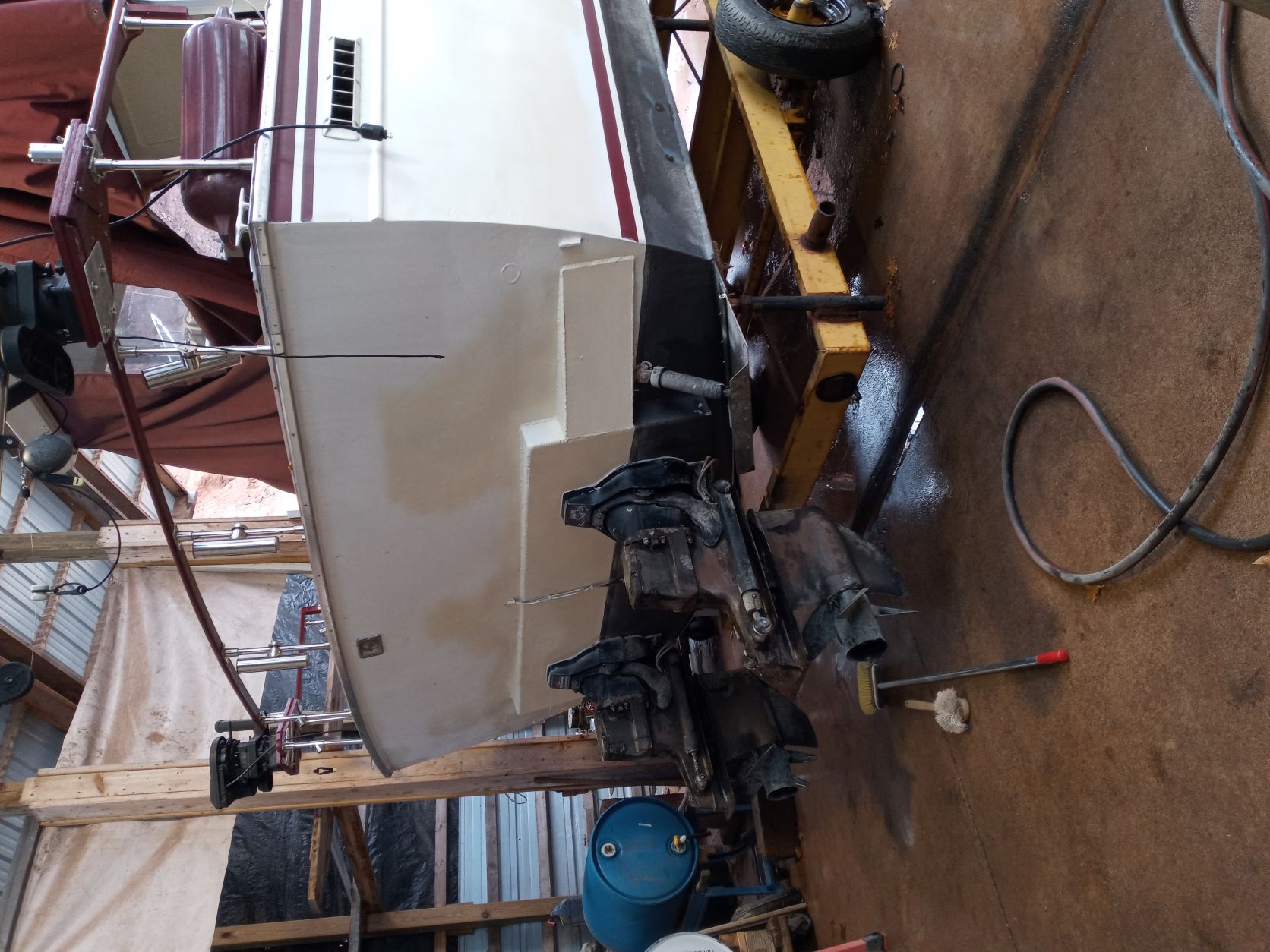 Swapped trailers under boat. Borrowed a buddies trailer for it to sit on after the engines go in. Old trailer was too short and did not support the stern at all. We used a fork lift, loader and a couple tow straps to and it for the swap.