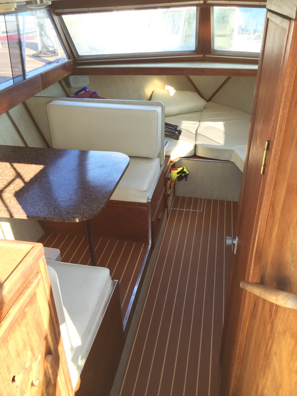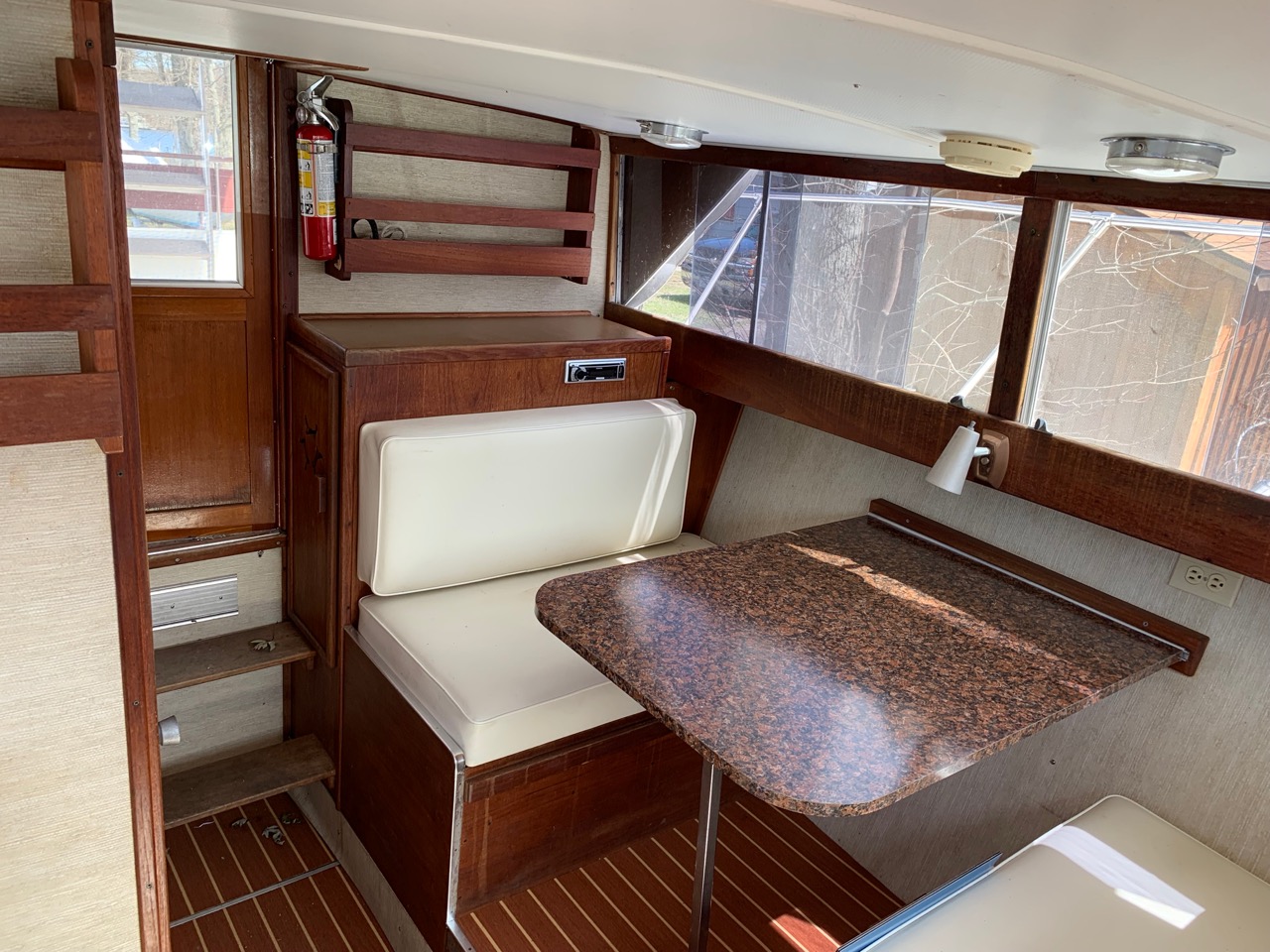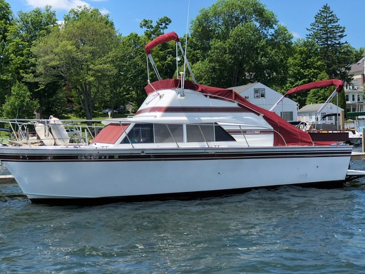 Rare 1982 Marinette 28ft. Twin gas Crusader 165HP 3.8L V6 inboard engines. 100 gal. fuel tank. 11ft. beam. Aluminum hull with new bottom pain spring2018. New teak and holly PlasTEAK vinyl cabin sole, flybridge deck PlasDECK teak w/ white lines. All flybridge teak refinished in 2018. New enlarged PlasTEAK swim platform with transom passthrough and undermount stainless extension ladder. Flybridge and aft deck bimini tops. Full flybridge enclosure. Cabin has new countertops and reupholstered dinette and v-berth cushions. New cabin side windows with tinted glass and upgraded aluminum window tracts. Sleeps 4. Hummingbird depth/fishfinder with GPS. Head with removable port-a-potty, but plumbing for pump out head installed. Two burner electric cook top (not presently installed). Space for undercounted fridge. Shore power and onboard battery charger/tender. Electric water heater 35 gal fresh water tank. Cruising speed 18 MPH, max speed 26 MPH. Both engines run strong, starts immediately and do not burn oil or smoke. Hours unknown. New high output alternator on starboard engine. All work completed within the last three years. Boat is in winter storage at The Boatworks in Celeron, NY on Chautauqua Lake.