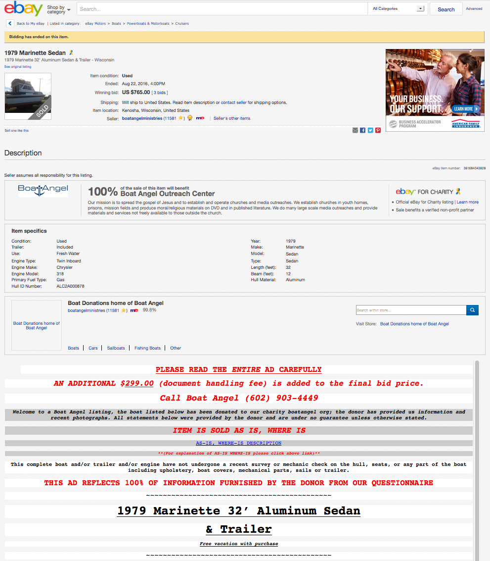 I followed that one too. Auction was from Boat Angel Ministries. People donate their boat to their cause and get a write off. Kind of like Goodwill. Free vacation w purchase. There is a $299 document handling fee. They have some interesting boats on auction at times.