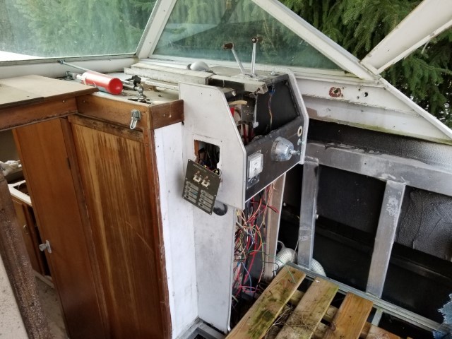 Pics from my visit last Sunday. I'm making arrangements to haul her closer to home and begin working on her restoration. The good, the bad and the ugly. Everything will be pulled out, tanks cleaned and/or replaced, all new wiring and thru-hulls, wood refinished or replaced and just look at that lovely helm! Good thing I know how to fix all this!