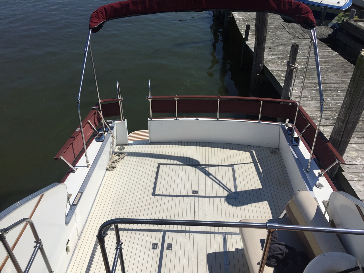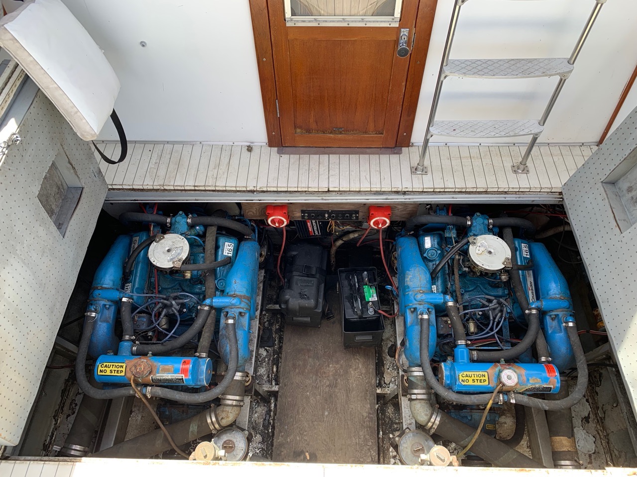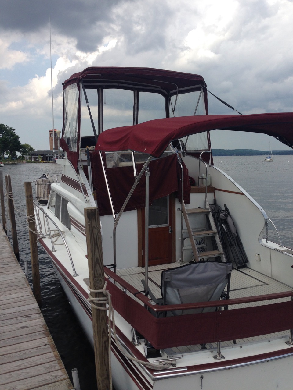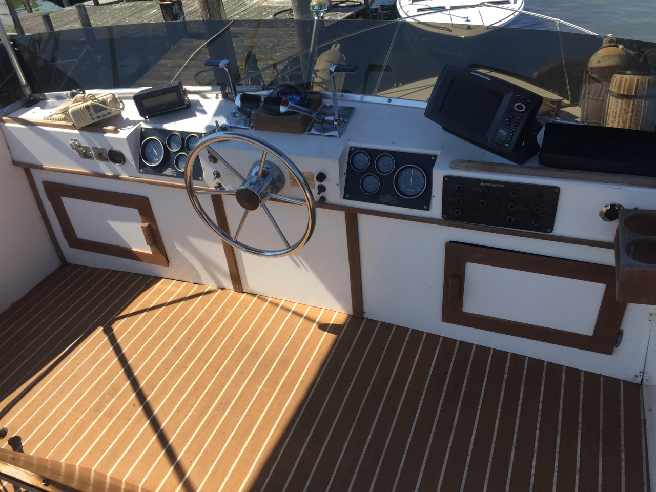 Rare 1982 Marinette 28ft. Twin gas Crusader 165HP 3.8L V6 inboard engines. 100 gal. fuel tank. 11ft. beam. Aluminum hull with new bottom pain spring2018. New teak and holly PlasTEAK vinyl cabin sole, flybridge deck PlasDECK teak w/ white lines. All flybridge teak refinished in 2018. New enlarged PlasTEAK swim platform with transom passthrough and undermount stainless extension ladder. Flybridge and aft deck bimini tops. Full flybridge enclosure. Cabin has new countertops and reupholstered dinette and v-berth cushions. New cabin side windows with tinted glass and upgraded aluminum window tracts. Sleeps 4. Hummingbird depth/fishfinder with GPS. Head with removable port-a-potty, but plumbing for pump out head installed. Two burner electric cook top (not presently installed). Space for undercounted fridge. Shore power and onboard battery charger/tender. Electric water heater 35 gal fresh water tank. Cruising speed 18 MPH, max speed 26 MPH. Both engines run strong, starts immediately and do not burn oil or smoke. Hours unknown. New high output alternator on starboard engine. All work completed within the last three years. Boat is in winter storage at The Boatworks in Celeron, NY on Chautauqua Lake.