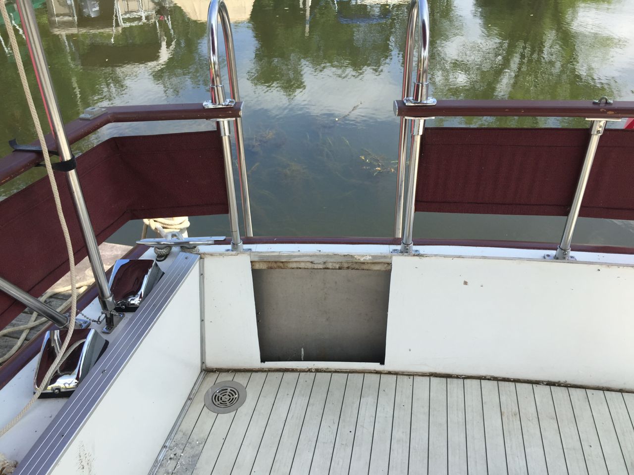 The boat is a 1982 28' Sportsfisherman with twin V6 165 HP Crusaders. It is used for day outings with the family and fishing. I wanted better access to the water and lifting little kids and a yellow lab over the railing got old real fast so I came up with a solution. Cut a gate, add railings and larger swim platform. The swim platform was made by plasTEAK outside Akron, OH. It is made of recycled plastic. I made a cardboard template off the old short platform and simply extended it and sent them the form. It is aprox. 101.5 in. by 34 in. They have different colors to match your boat. https://www.plasteak.com. (I also used their sister company products for the flybridge deck and cabin sole. PlasDECK.com) The cost was $1380.00 and $245 for the under mount stainless ladder. I hired a local welder to remove the old platform and build braces similar to the original structure but with longer angle braces. The ladder and transom gate was added later. First the ladder with a temporary step. I bought the railing and hardware on line and a local machine shop made the bends. It was then just a matter of cutting the railing to length and mounting the hardware. The gate was also rather easy once I made sure all the cuts were aligned correctly. First I cut the inner panel, using a T square to make sure the cuts were vertical. Then again using the right angle guide to make sure the outside cuts were parallel to the inner ones. Drill a hole in the lower corners and I used a battery powered DeWalt Sawzall. I then sealed off the gap with high density 1/2 plastic boarding. Similar to a plastic cutting board, but any material would do. I used some 3/4 inch aluminum angle stock to mount the plastic. I was thinking about replacing the plastic with aluminum to keep with the Marinette theme. I have some of the board left and have some stainless hinges to make a gate but.....now it's boating season and I don't want to work on it with a drink in my hand!