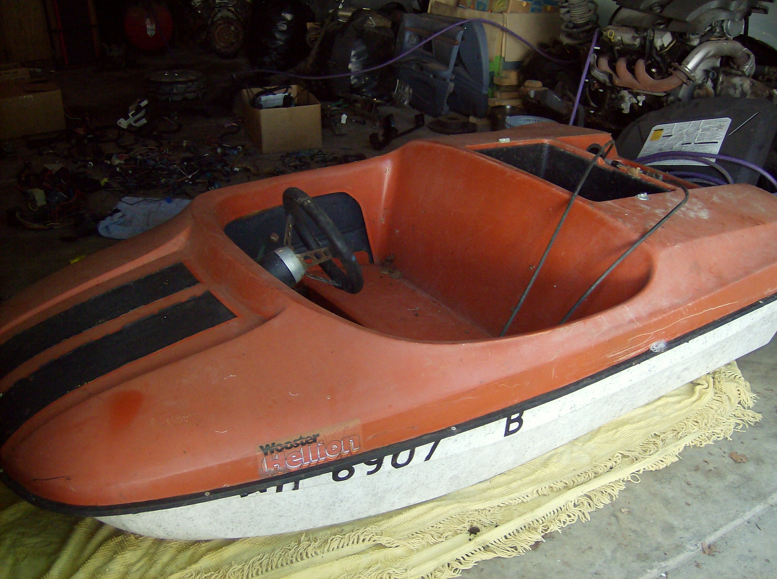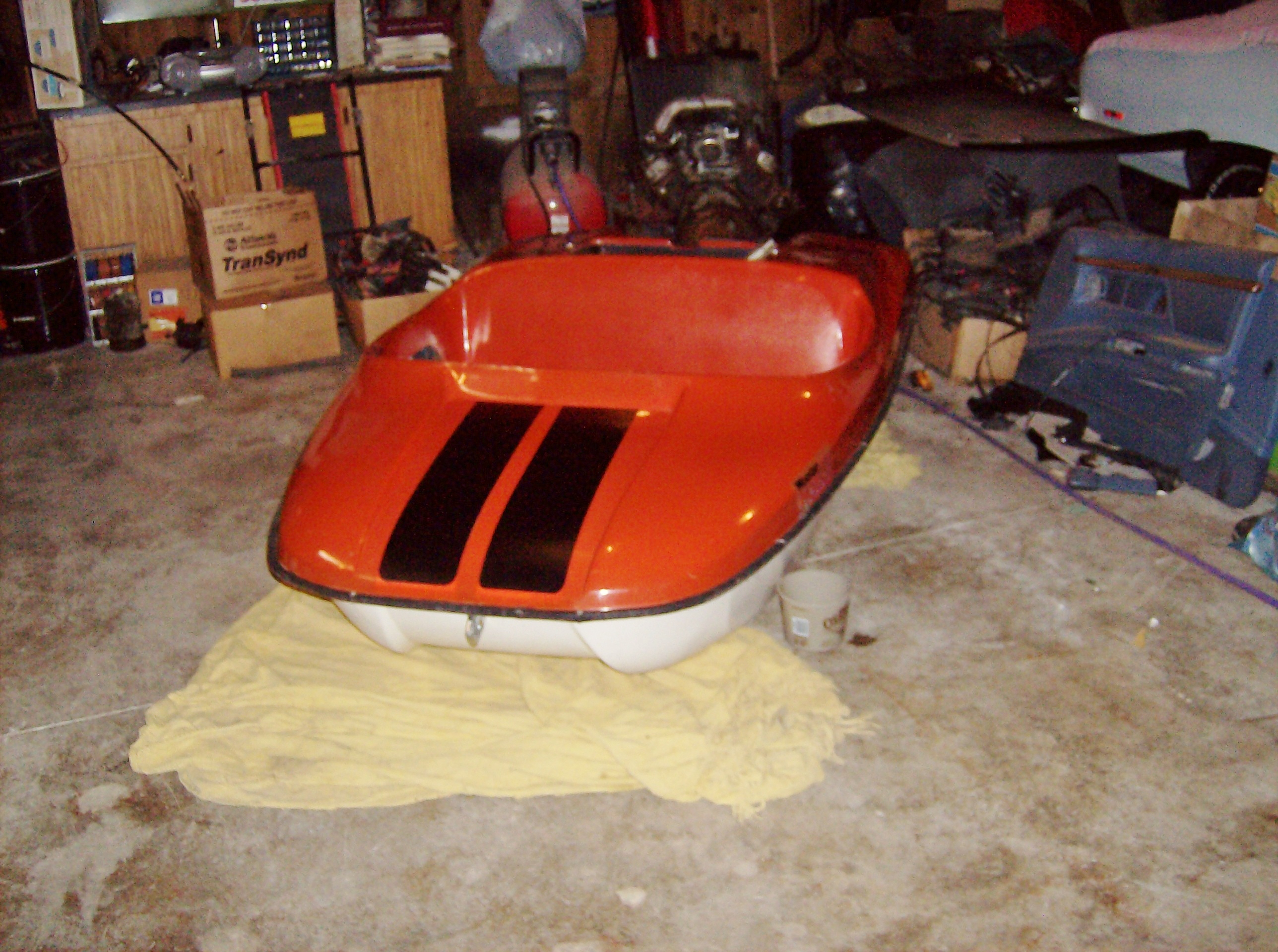 Sat in the barn since 1972 or so (steering cable broke). Took about 40 hours to polish the gelcoat back to it original color. Rated for a 10 HP, but found a 14 HP Sears Elgin for it. Fun for next summer !